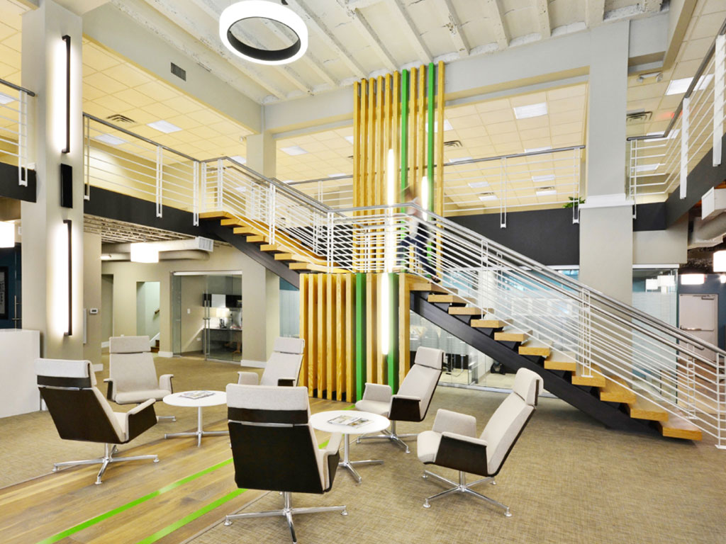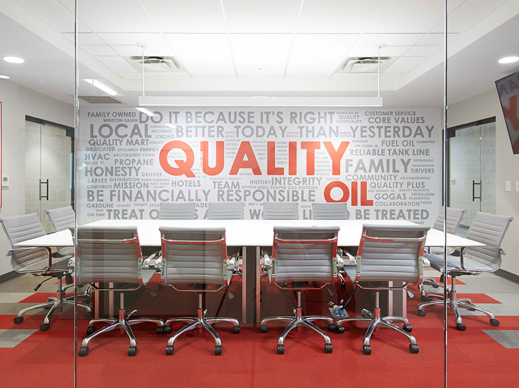 This project involved the renovation of Quality Oil’s Corporate Headquarters in a 1960s building in Winston-Salem. Nearly 11,000 square feet of office space, conference rooms, break room and mail room was completely gutted and renovated. Updates include paint, new flooring, Corian reception desk, new outdoor patio, new interior glass walls and doors and a new cedar and metal building entrance. Existing office walls were torn down to achieve modernized, open work spaces.