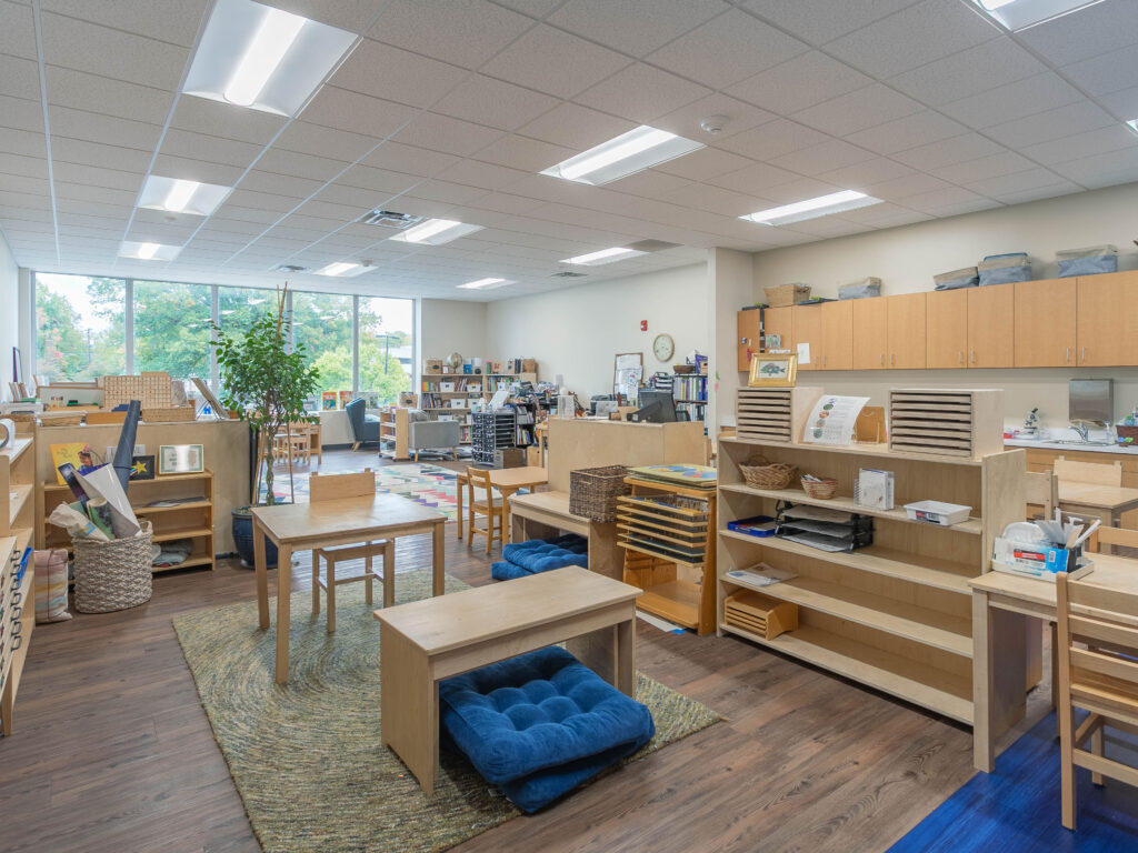To create the new space for Salem Montessori School, a former bank was renovated into a learning environment. Each of the classrooms features natural light, an enclosed outdoor activity space, and flexible learning areas. There is also a large gathering area that accommodates up to 130 individuals. The renovation was designed with proper Montessori design techniques that promote the development of children.