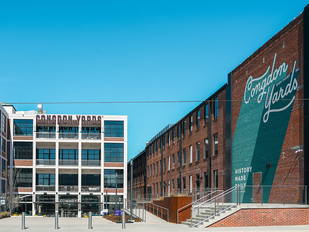 The Factory at Congdon Yards is a mixed-use historic rehabilitation in downtown High Point, NC. This 93,357 square foot space holds office and co-working space for businesses. It also includes an art gallery with classrooms, multiple gatherings, and common areas.